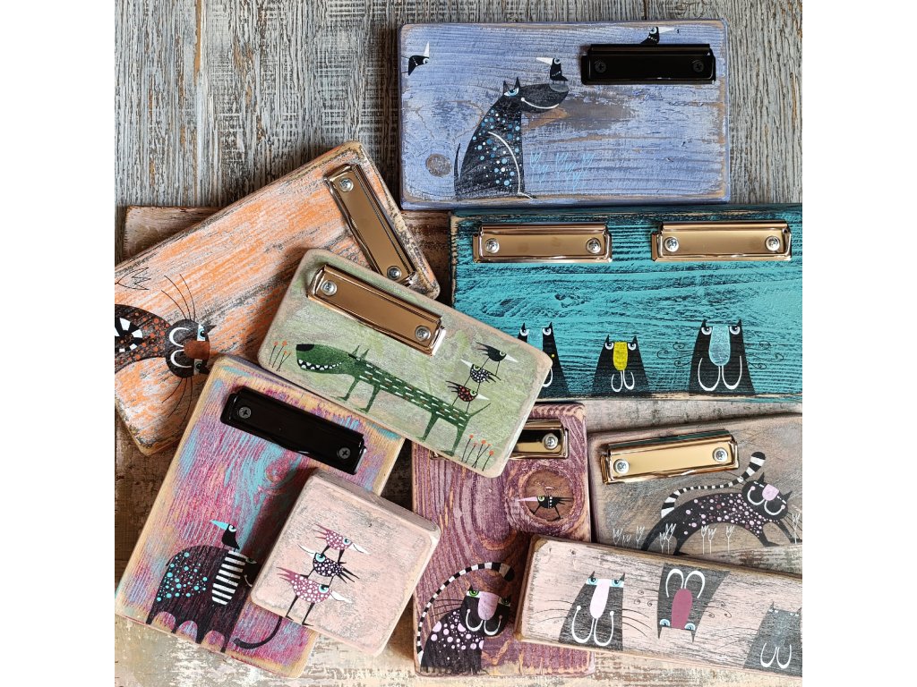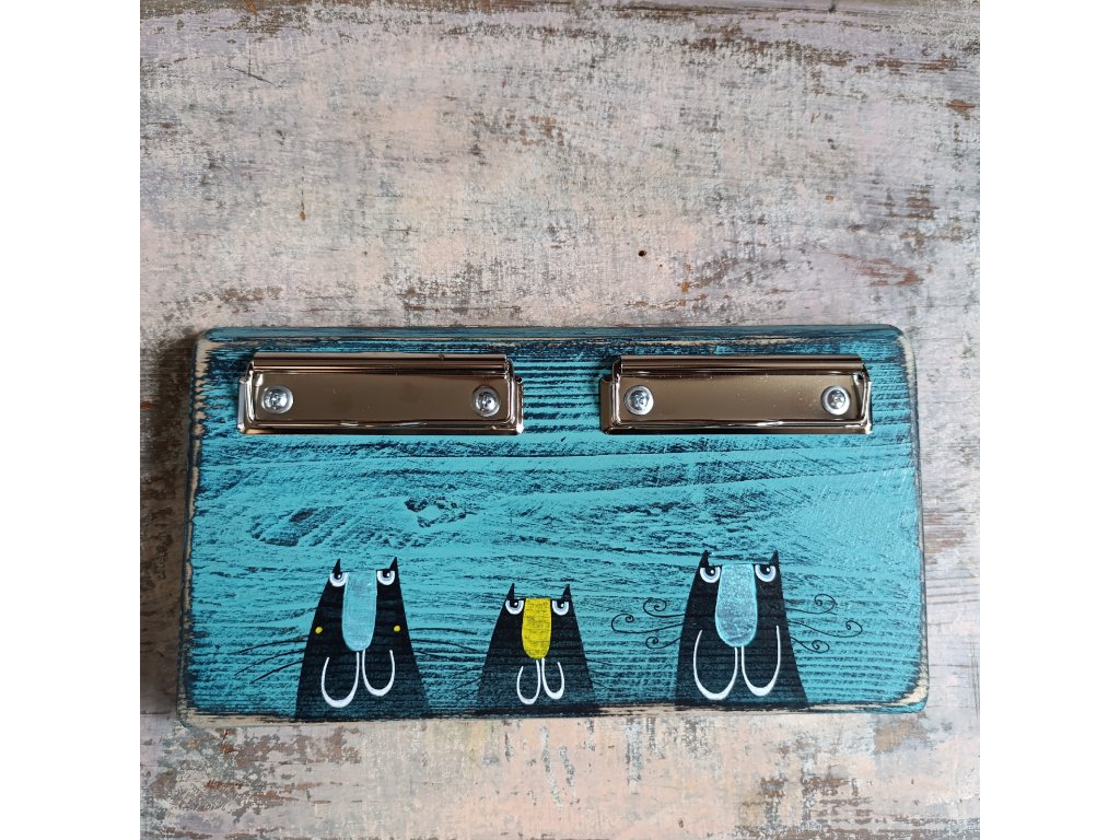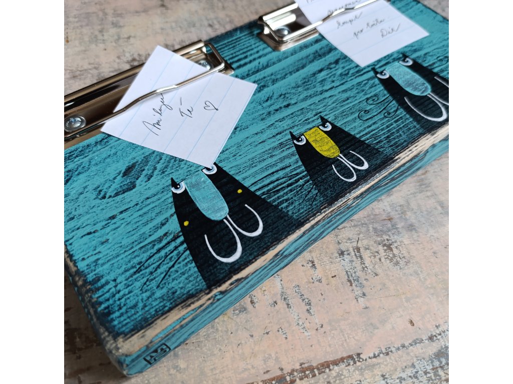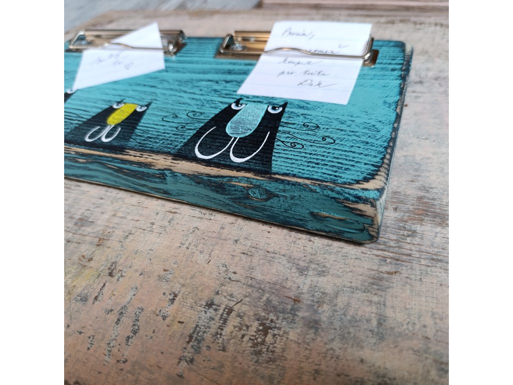 Slouží jako dekorace – ideální jako zápisníkovník na vzkazy, poznámky a dokumenty, které vám „pohlídá“, aby vám neulétly ulétly s prvním závanem větru. Pružinová svorka stříbrné nebo černé barvy. Ze zadní strany filcové kulaté podložky a též i závěs k zavěšení.