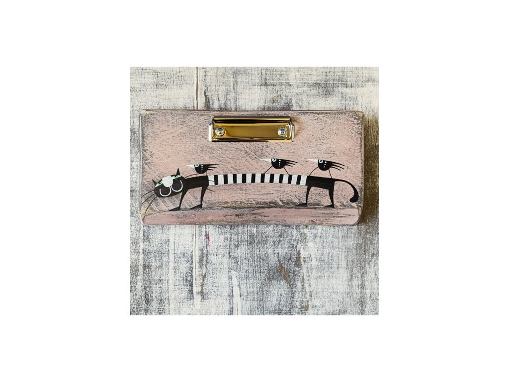 Slouží jako dekorace – ideální jako zápisníkovník na vzkazy, poznámky a dokumenty, které vám „pohlídá“, aby vám neulétly ulétly s prvním závanem větru. Pružinová svorka stříbrné nebo černé barvy. Ze zadní strany filcové kulaté podložky a též i závěs k zavěšení.